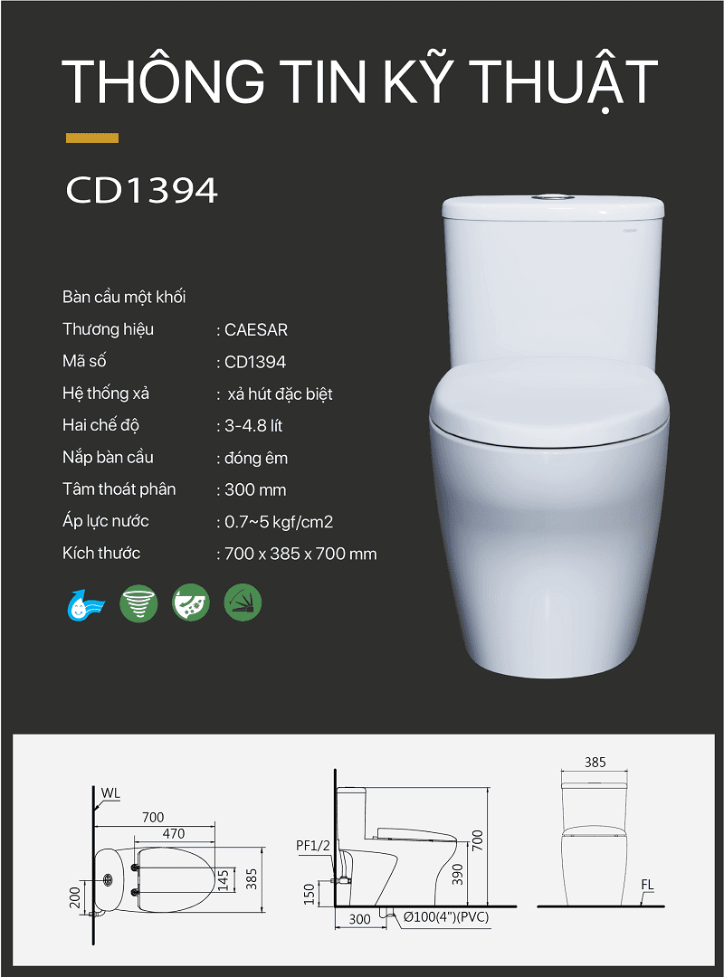 Thông tin bàn cầu 1 khối Caesar C1394: