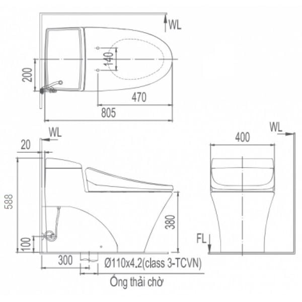 - Kích thước bồn cầu: 805 x 400 x 588 mm (dài x rộng x cao)