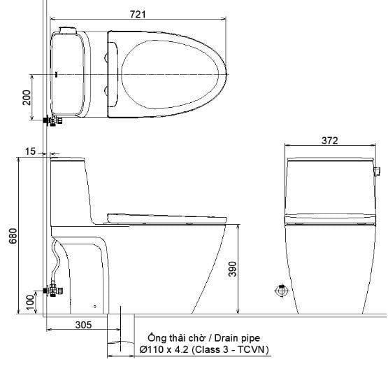 - Kích thước bồn cầu AC-912: 721 x 372 x 680 mm (dài x rộng x cao)