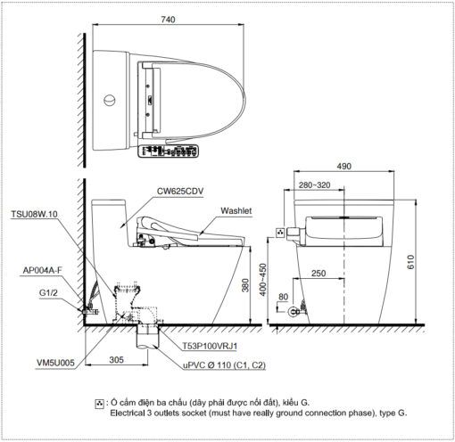 Thông số kỹ thuật bàn cầu 1 khối Toto MS625CDW17#XW