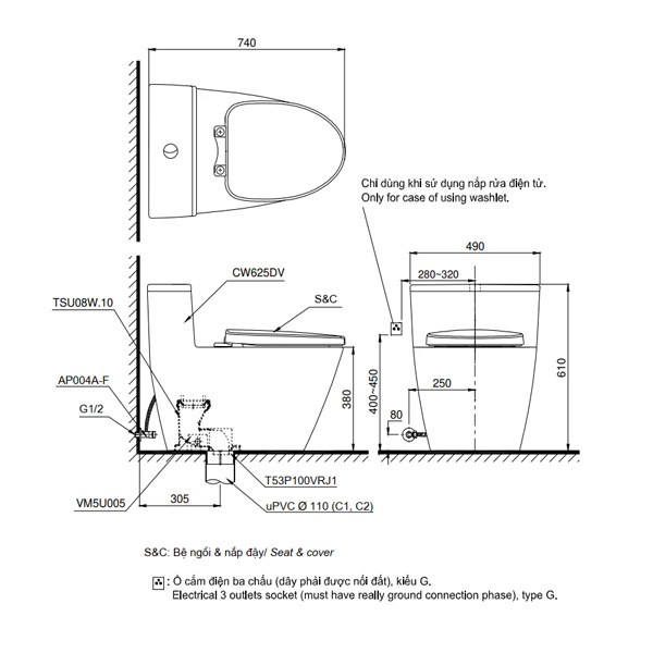Bàn cầu 1 khối Toto MS625DT2#XW