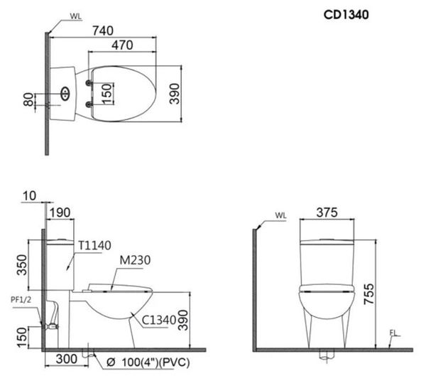 Bản vẽ bàn cầu 2 khối Caesar CD1340/TAF710H