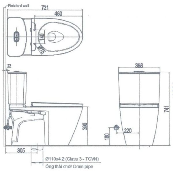Bản vẽ kĩ thuật bàn cầu 2 khối nắp điện tử Inax AC-602+CW-KB22VN