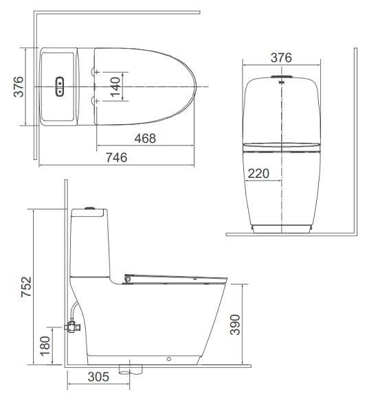 - Kích thước bồn cầu: 746x376x752 mm (DxRxC)