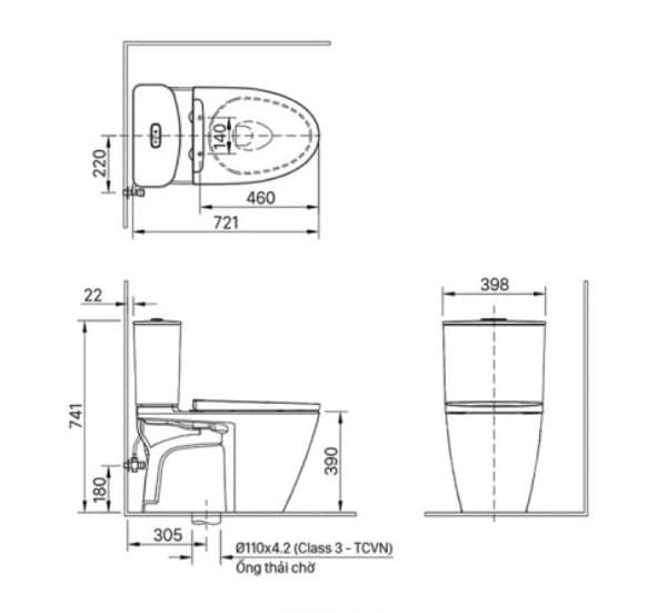 Bản vẽ kĩ thuật bàn cầu 2 khối nắp điện tử Inax ACT-602+CW-H17VN