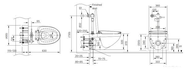 Bản vẽ kĩ thuật bàn cầu treo tường nắp điện tử Inax AC-22P+CW-H18VN