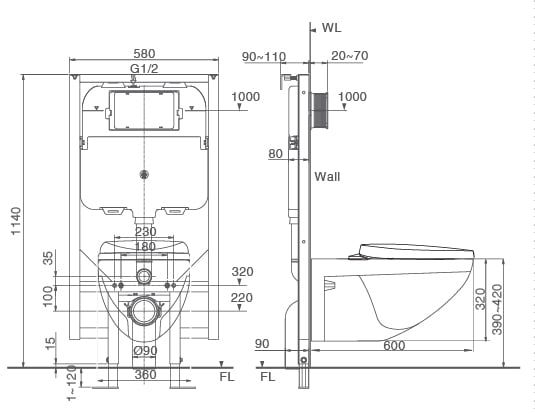 - Bàn cầu treo tường thoát ngang, két nước âm tường