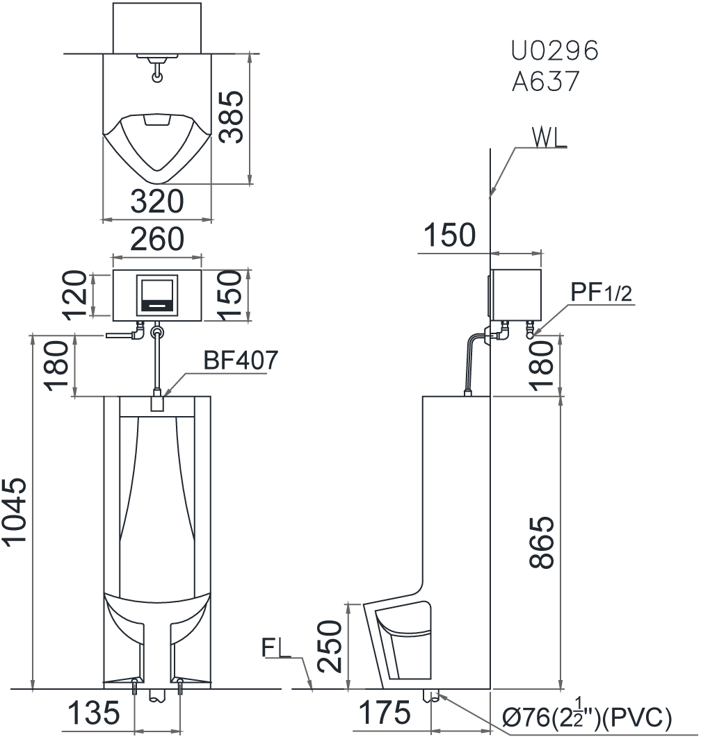 Bản vẽ Bệ tiểu nam đặt sàn Caesar U0296
