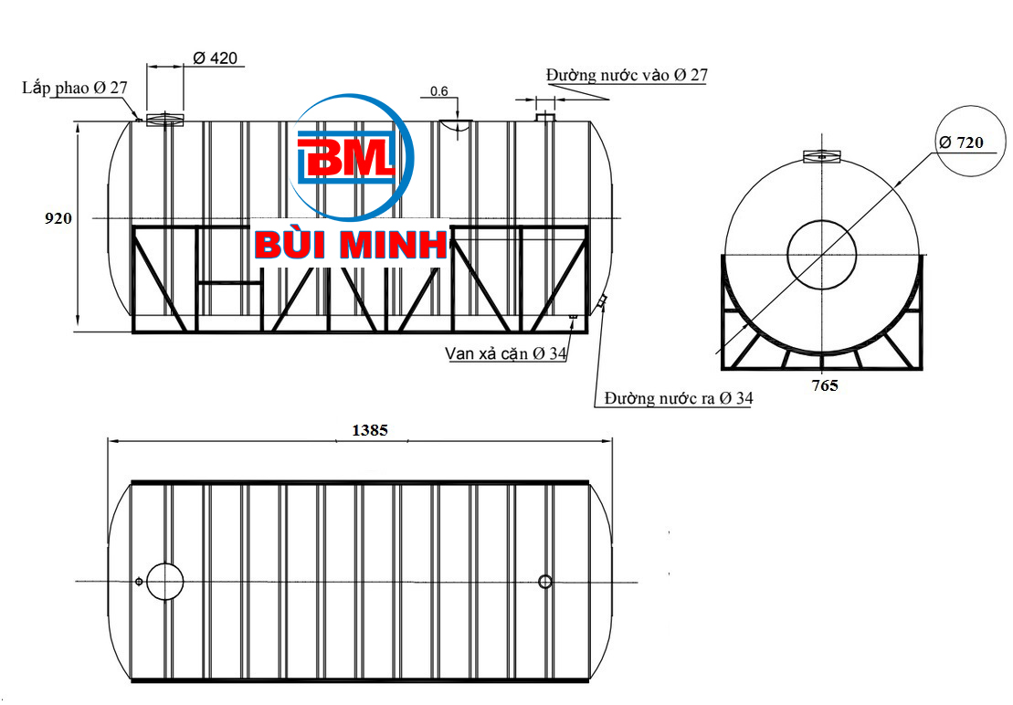 STT | Chủng loại | Đường kính thân bồn (mm) | Chiều dài thân bồn (mm) | Chiều cao chân (mm) | Chiều rộng chân (mm) | Chiều cao tổng (mm) |