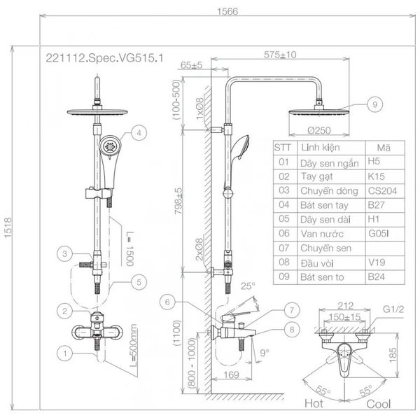 Bản vẽ kỹ thuật vòi sen cây Viglacera VG 515.1