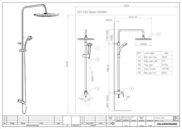 Bản vẽ kĩ thuật sen tắm cây Viglacera VG594