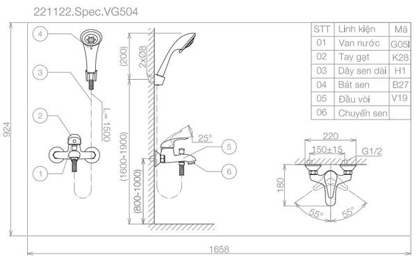 Bản vẽ kĩ thuật sen tắm nóng lạnh Viglacera VG504