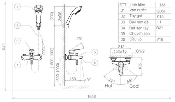 Bản vẽ kĩ thuật sen tắm nóng lạnh Viglacera VG515