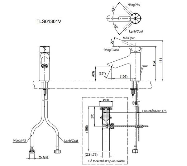 Thông số kỹ thuật vòi chậu nóng lạnh Toto TLS01301V