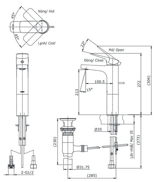 - Áp lực nước: 0.05MPa ~ 0.75MPa